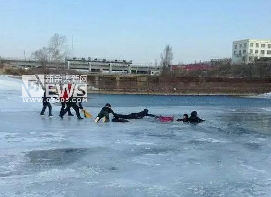 男女走冰湖落水5人用围巾做救命绳拽其上岸