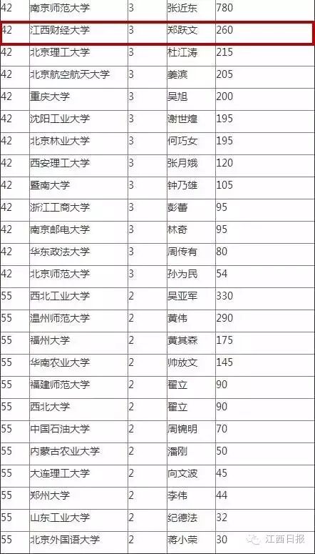 根据榜单显示,以3人排在第42名的江西财经大学为上榜的唯一一所江西高校,首富为郑跃文,财富260亿元。