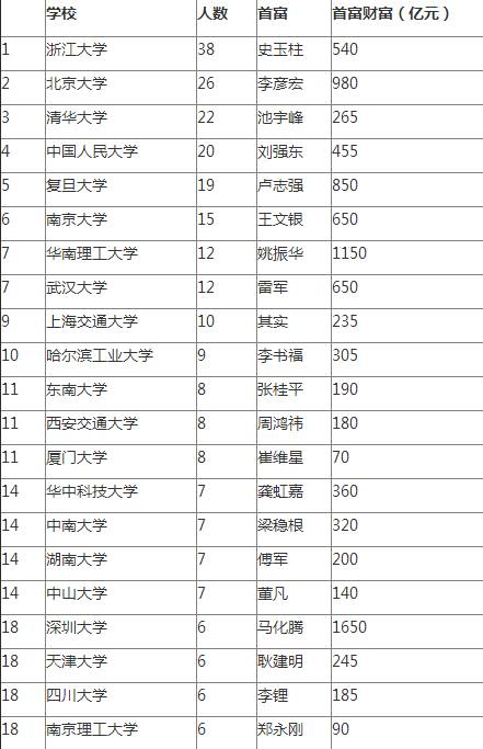 11月4日,胡润研究院首发《2016胡润百富榜校友会特别报告》,有66所国内高校都至少有2位校友登上今年胡润百富榜,其中浙大以38人排名第一,南京大学15人位居第六。